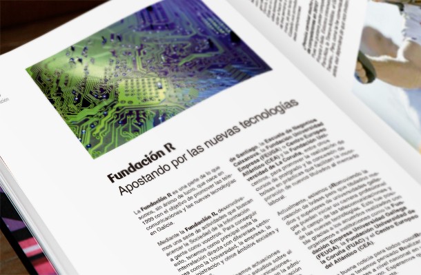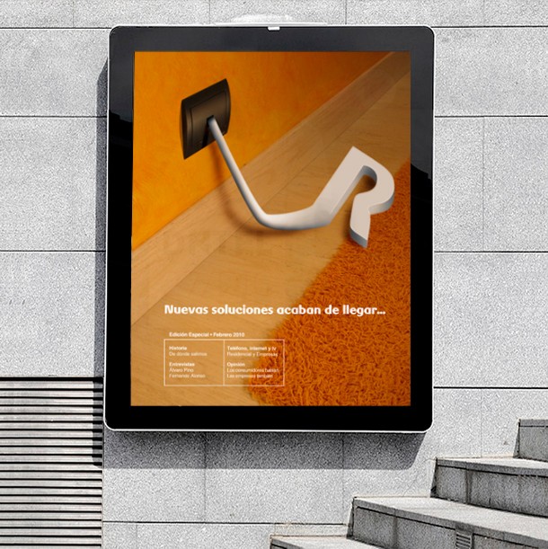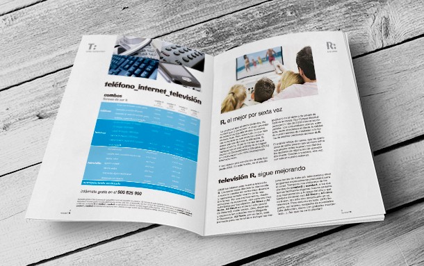 R es un operador de televisión, cable e internet por fibra óptica que opera en Galicia desde 1998. En 2010, junto con David Garea, Marta Herrero y Ananda Von desarrollamos un simulacro de proyecto de comunicación, basado en una teórica expansión de la empresa a nivel nacional, el cual fue presentado ante miembros de la compañía gallega. Entre las acciones, destacó el trabajo de publicidad (materiales promocionales, cartelería, uso de medios no convencionales, spot) así como las labores de diseño editorial, realizando un número completo de la revista mensual de R.